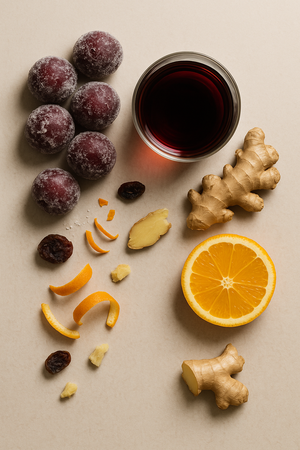 A toast to the season’s most indulgent moments. Sugared plums swirl with red wine and a whisper of fresh ginger, brightened by a twist of orange peel. The result is a warm, intoxicating blend — equal parts sweetness and spice — reminiscent of a festive evening by the fire, where laughter lingers and the night feels endless.